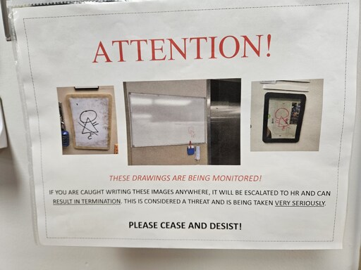 I mean if it was on a bulletin board in the corner of the break room you’d have a point, but this is right next to the punch clock with a big red ATTENTION written on it. Even if you assume there was no mass email or meeting about it, I’d say this qualifies as informing your employees