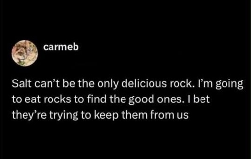 Hell yeah, brother, fight the system! Don’t let Big Geology tell you want to do! Eat those rocks!