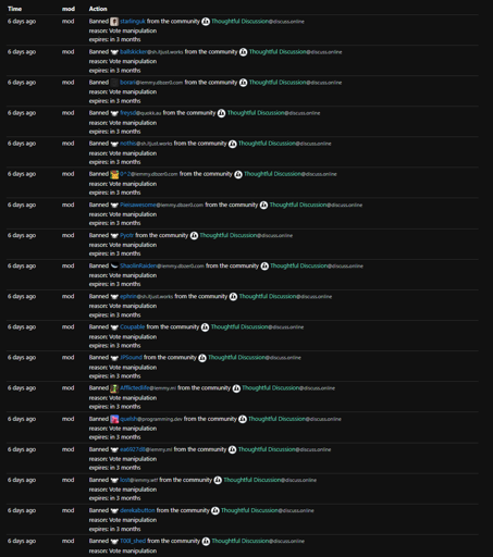I don’t understand what you think this has to do with dbzer0? The majority of the bans are not even from that instance; only 4 out of the 18 people in the screenshot are dbzer0 users.