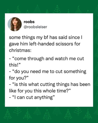 If you’re left-handed and you think left-handed scissors are a meme, go and spend the $14 that it costs for a pair of left-handed scissors and report back and tell me that that shit is not life-changing.