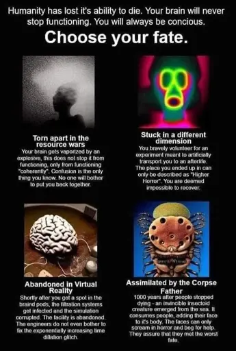 minus-squareAnchoriteMagus@lemmy.worldlinkfedilinkEnglisharrow-up14·4 days agoAssimilation by the Corpsefather is the only option to give you 1000 years of unfettered freedom first. Go big or go home. I pick the Corpsefather so that I can spend 1000 years free of resource wars, VR hellscapes, and alternate dimension experiments. Hell, after 1000 years of accumulated experience, I’ll probably already be insane by the time Dad shows up anyway.