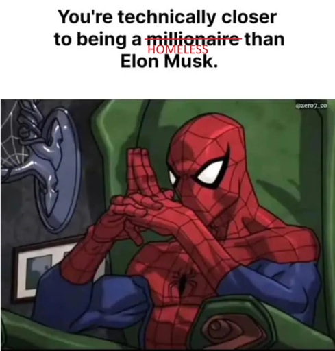 minus-squareDragonTypeWyvern@midwest.sociallinkfedilinkarrow-up3·2 months agoMillionaires are closer to being homeless than Elon Musk is to being a millionaire