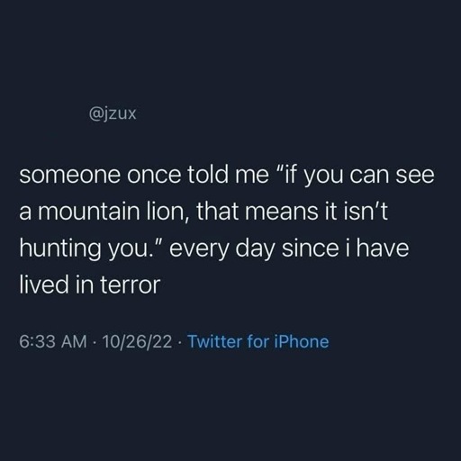 I saw a mountain lion in the closet, which means it’s not hunting me. Who else is hiding in the room…