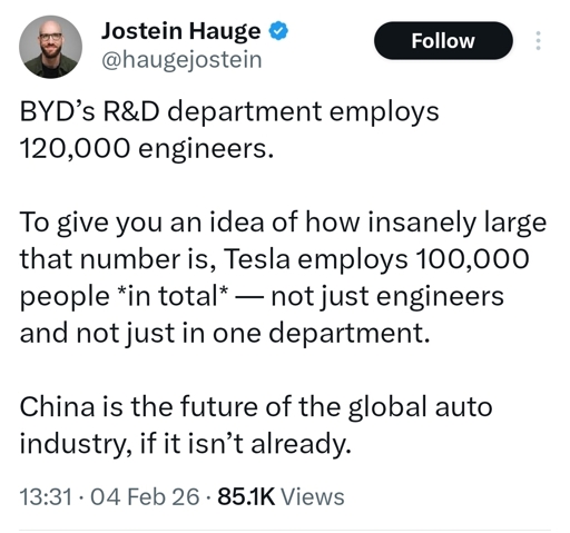 - For BYD : « BYD has the most R&D personnel among automakers and nearly 110,000 engineers, CEO says »
