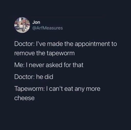 arrow-up1484arrow-down1imageMy poor tapewormlemmy.worldickplant@lemmy.world to Lemmy Shitpost@lemmy.world · 10 days agomessage-square12linkfedilink