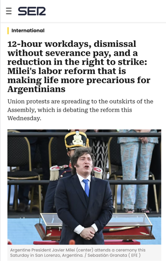 The reform introduces a profound change in the labor regime and would be a political victory for Milei, while Argentina’s largest labor union, the General Confederation of Labor (CGT), and other unions prepare to mobilize in front of Congress amid a partial transportation strike.