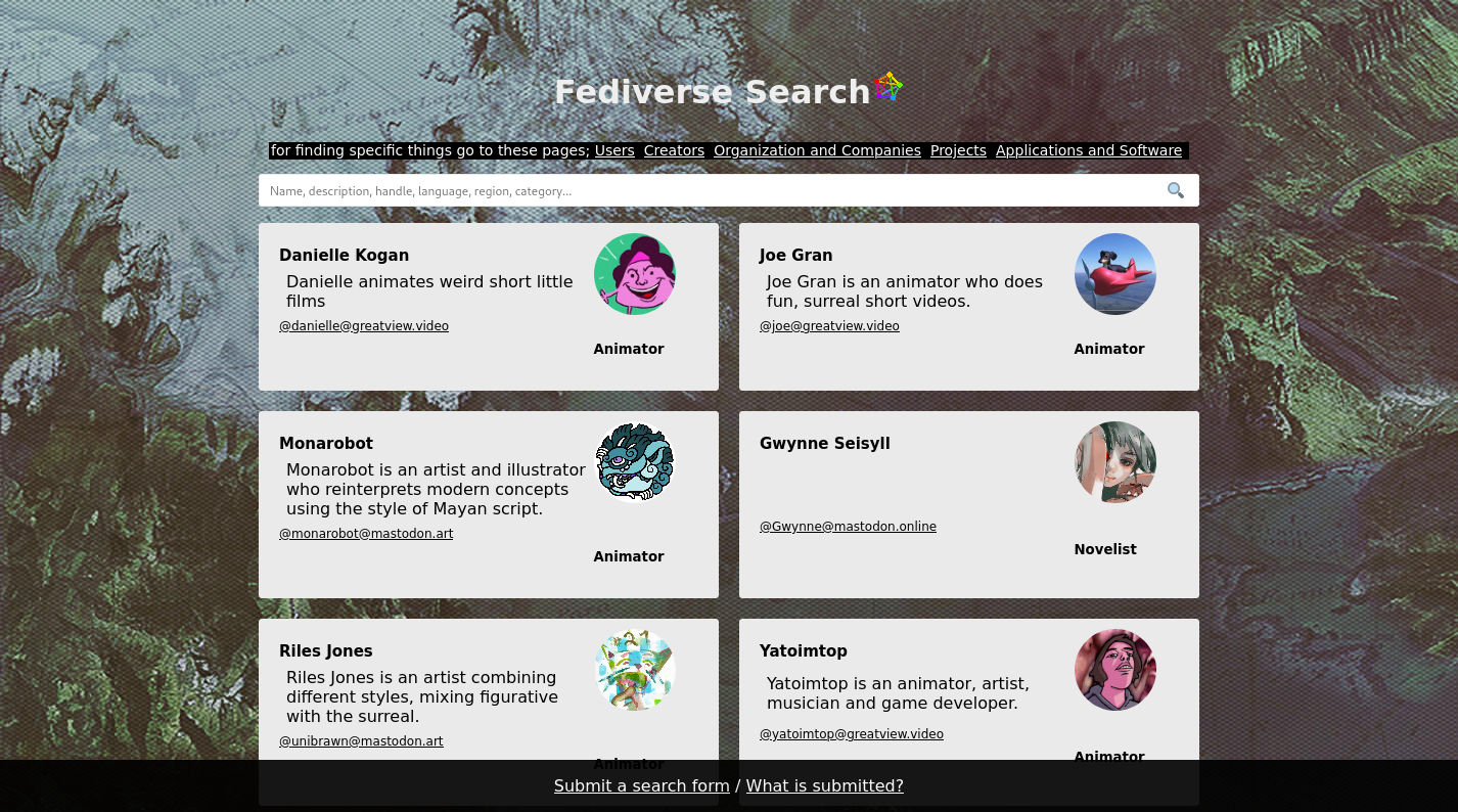 https://fedisearch.xyz A small project of mine, feel free to submit users and other things here.